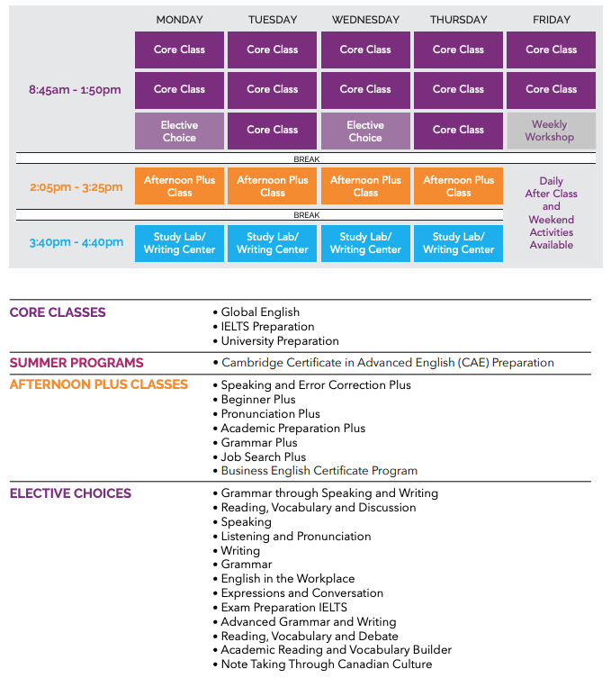 Une journée de cours s'articule autour du Core Class (anglais général, IELTS) et les Elective Choice qui permettent de travailler différemment l'anglais. Les cours de l'après-midi permettent de se spécialiser et de travailler ce qui vous parait le plus pertinent pour votre progression. Bous avez le choix entre 28 et 36 cours par semaine.